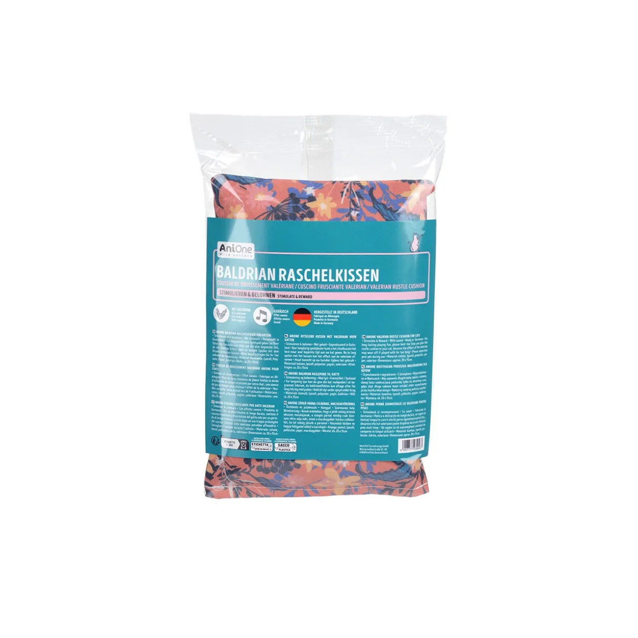 Offrez à votre chat le coussin bruissant AniOne à la valériane ! Il stimule et récompense en même temps, en étant combiné avec un jouet sonore excitant. Le coussin est fabriqué en Allemagne et est composé de coton, lyocell, polyester, papier et valériane. Ses dimensions sont d’environ 20 x 15 cm, parfait pour jouer et câliner. Votre chat l’adorera, mais veillez à ne lui donner le coussin que pour une durée limitée, car l’effet de la valériane pourrait sinon s’estomper.