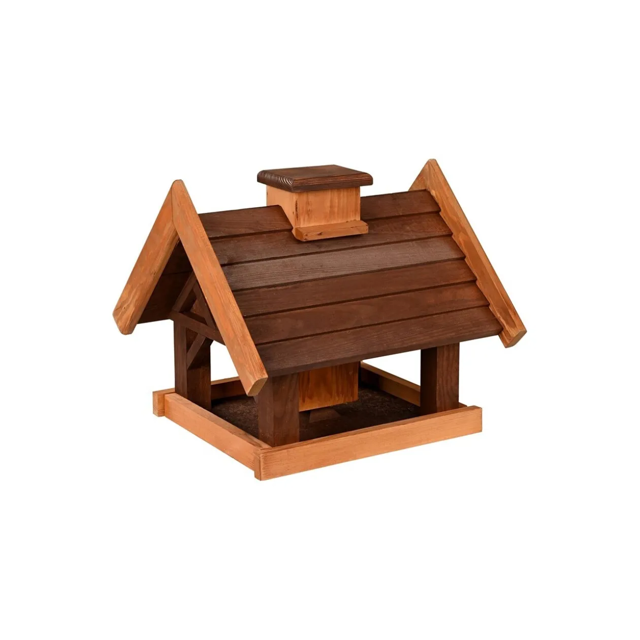 Le silo protège la nourriture des mauvaises conditions météorologiques, en outre, le auvent offre également à l’oiseau une place au sec. Avec la peinture lasurée résistante aux intempéries, la mangeoire peut rester dehors toute l’année.