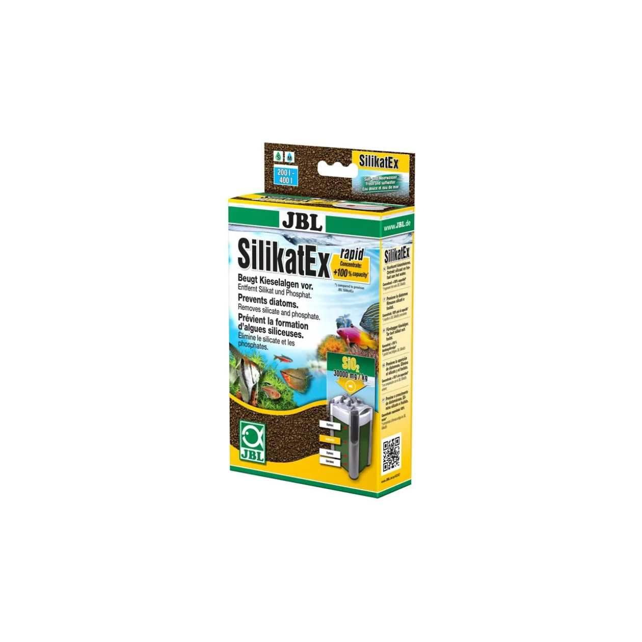 Les restes de plantes, de nourriture et les produits métaboliques dégradent la qualité de l’eau de l’aquarium. Une bonne qualité d’eau est nécessaire pour favoriser la santé des poissons et des plantes dans l’aquarium. Celle-ci peut être obtenue avec divers filtres et différents matériaux de filtre. Les filtres aspirent l’eau de l’aquarium et retirent les salissures et les déchets de l’eau par le matériau filtrant. Filtrage fin SilikatEx retire le Silikat des aquariums d’eau douce et d’eau de mer. Cela permet de retirer les algues brunes indésirables (dépôts bruns) qui apparaissent souvent après l’ajout d’eau fraîche. SilicatEx retire entre autres aussi le phosphate et contrôle ainsi la croissance d’autres algues. Le matériau filtrant crée des conditions de vie adaptées au biotope. 1 pack (500 g) absorbe 5000 mg/l SiO₂ et suffit pour 200 – 400 litres.