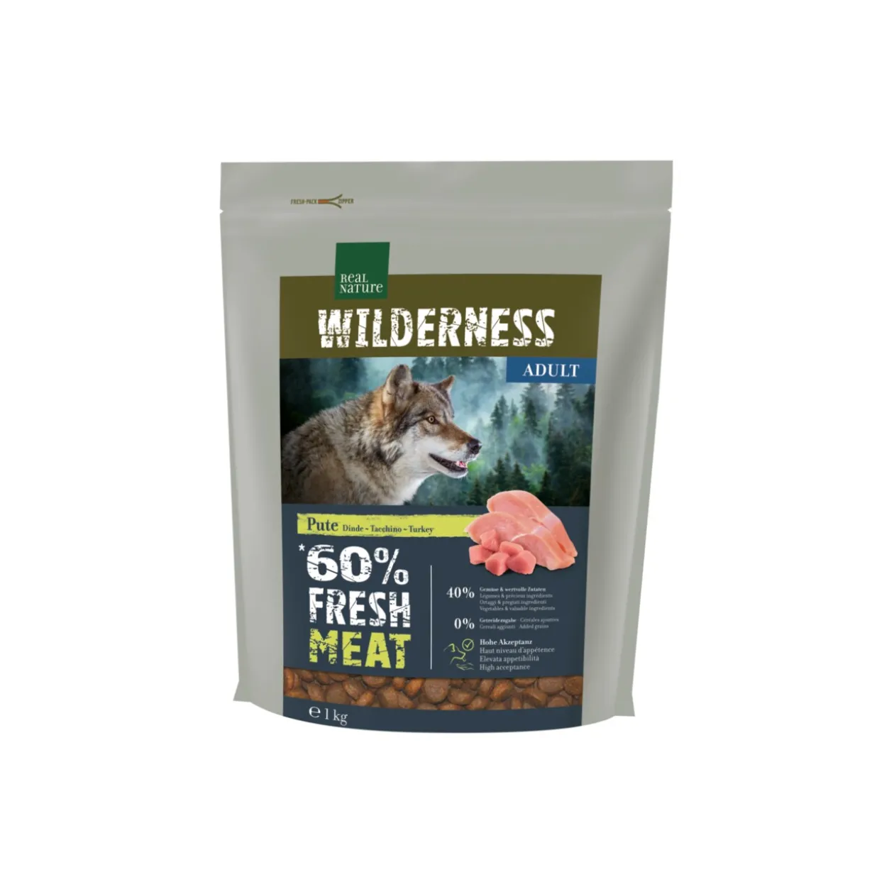 REAL NATURE WILDERNESS Fresh Meat respecte la nature de votre chien. Avec une portion extra de viande fraîche, nos produits s’inspirent de l’alimentation du loup, ancêtre du chien, et vous permettent de nourrir votre chien en répondant au mieux à ses besoins.REAL NATURE WILDERNESS Fresh Meat, fabriqué à partir de 60 % de viande fraîche, est particulièrement savoureux et permet donc une acceptation élevée. Nos produits s’inspirent de l’alimentation du loup, l’ancêtre du chien, et vous permettent de nourrir votre animal en répondant au mieux à ses besoins. Cette formule se compose de 60 % de viande fraîche, source de protéines animales de haute qualité, de 40 % de légumes, de fruits et de précieux ingrédients, ainsi que de 0 % de céréales et de pommes de terre ajoutées. REAL NATURE WILDERNESS FRESH MEAT offre des ingrédients naturels sélectionnés minutieusement, complétés par de précieuses vitamines et substances minérales judicieusement adaptés aux besoins nutritionnels et physiologiques – formule garantie sans ajout de sucres, soja, arômes synthétiques, conservateurs, ou émulsifiants.