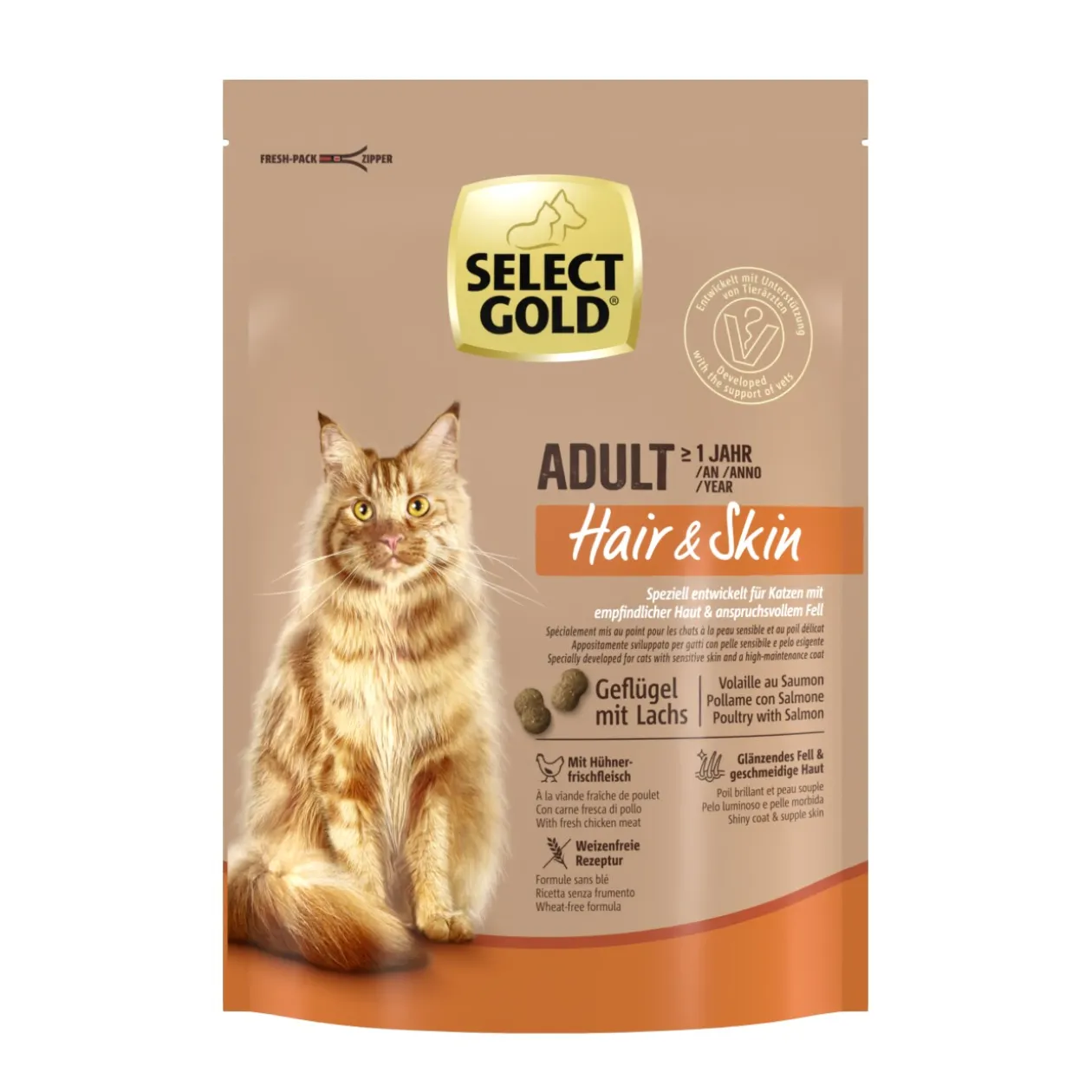 SELECT GOLD Hair & Skin Adult volaille au saumon est un aliment premium sec et équilibré, spécialement mis au point – Aliment complet pour les chats adultes à partir du 12ème mois environ. mois. Cet aliment sec de haute qualité, dont la recette ne contient pas de blé, est produit à partir de viande de poulet fraîche et savoureuse. Sa composition spéciale le rend particulièrement adapté aux chats à la peau sensible et au pelage dense ou plus long. Lors du développement de cette formule premium, les exigences physiologiques des chats adultes ont été prises en compte de manière ciblée.