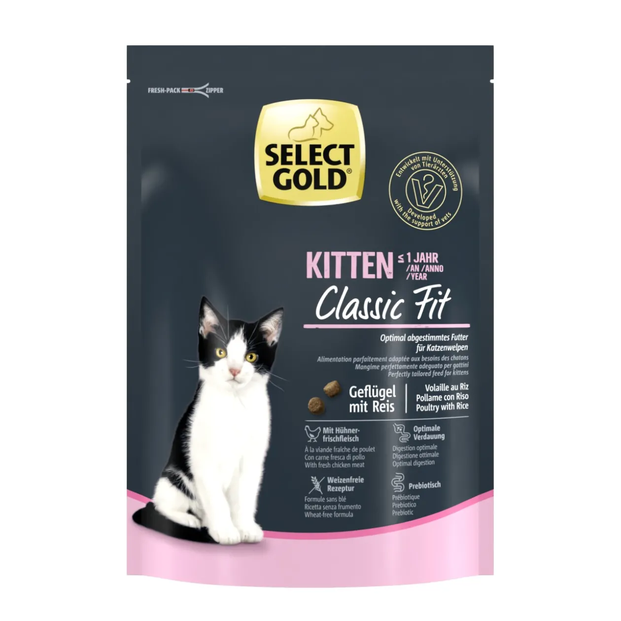 SELECT GOLD Kitten volaille au riz est un aliment sec complet premium équilibré, spécialement mis au point pour les chatons, d’env. 2 à 12 mois. Cette nourriture sèche de qualité supérieure à la formule sans blé est fabriquée en utilisant de la viande fraîche de poulet savoureuse et est, grâce à sa composition spéciale, parfaitement adaptée aux chatons au cours de la deuxième phase de croissance. Lors du développement de cette formule premium, les exigences physiologiques des chatons ont été prises en compte de manière ciblée.