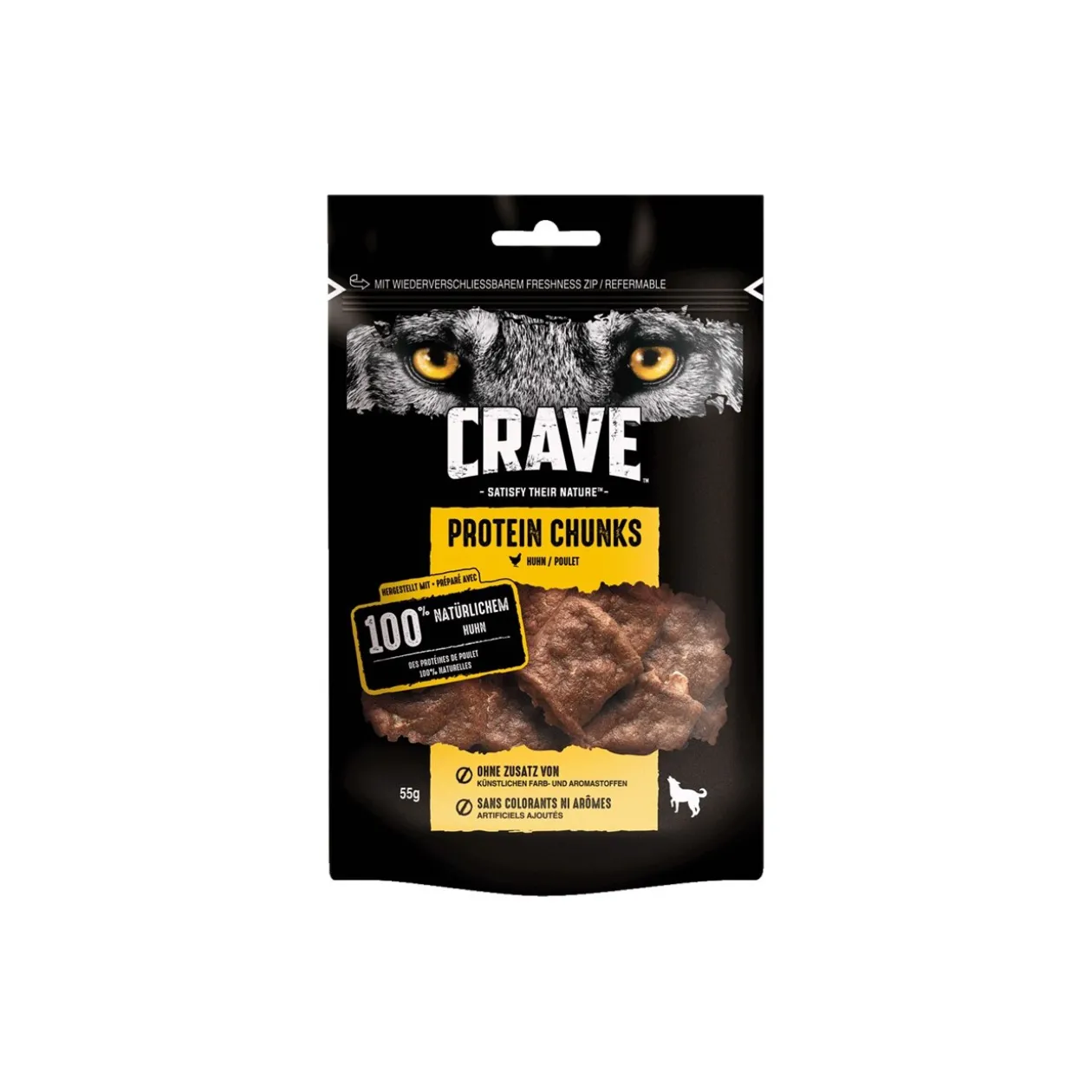 Récompensez votre chien avec CRAVE™ Protein Chunks au saumon : Friandises pour chiens sans céréales à base de protéines animales de premier choix et sans colorants, arômes ou conservateurs artificiels – pour un goût que les chiens adorent instinctivement.