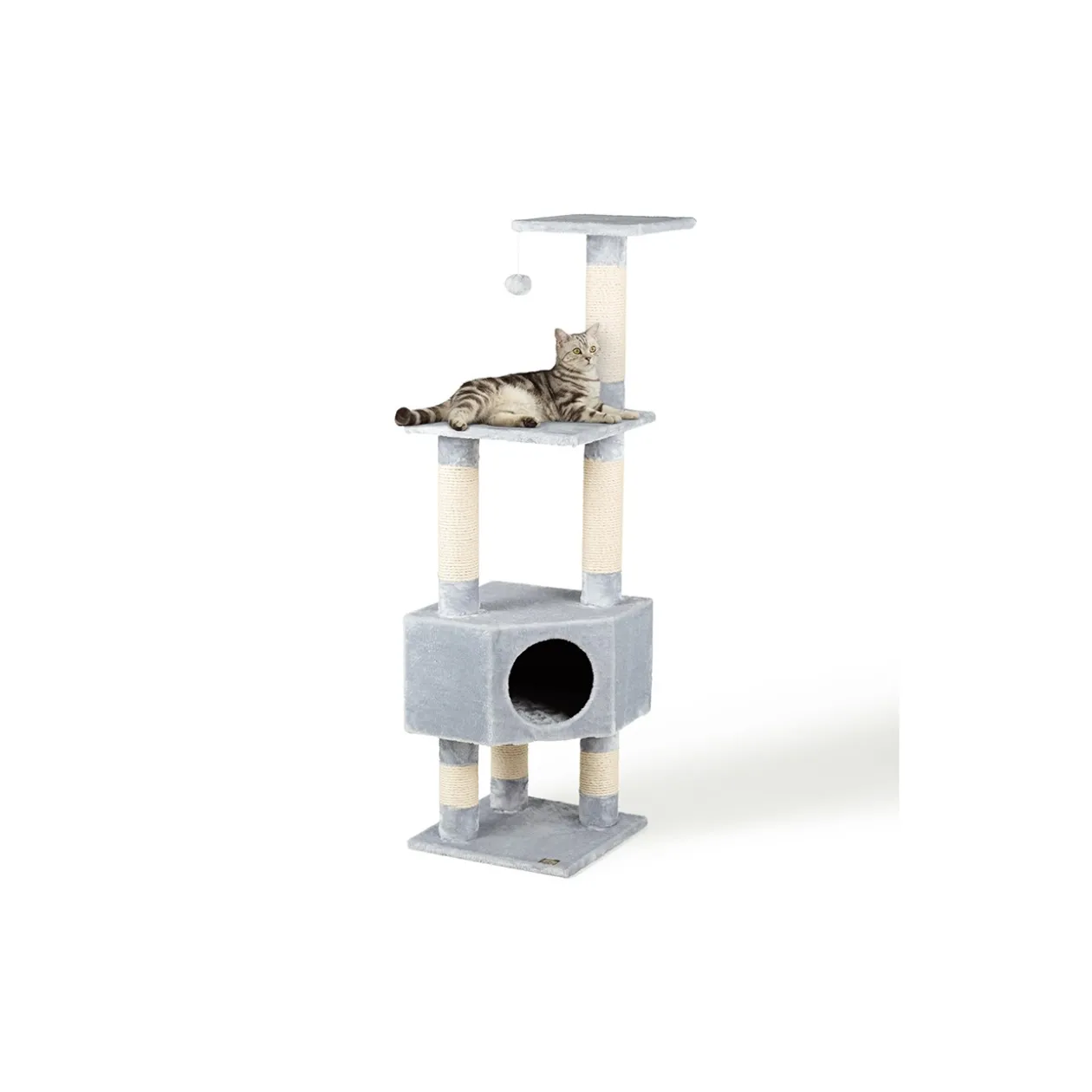 - arbre à chat de taille moyenne avec une grande grotte triangulaire, reposant sur trois colonnes en sisal (avec ouverture) et deux surfaces de repos