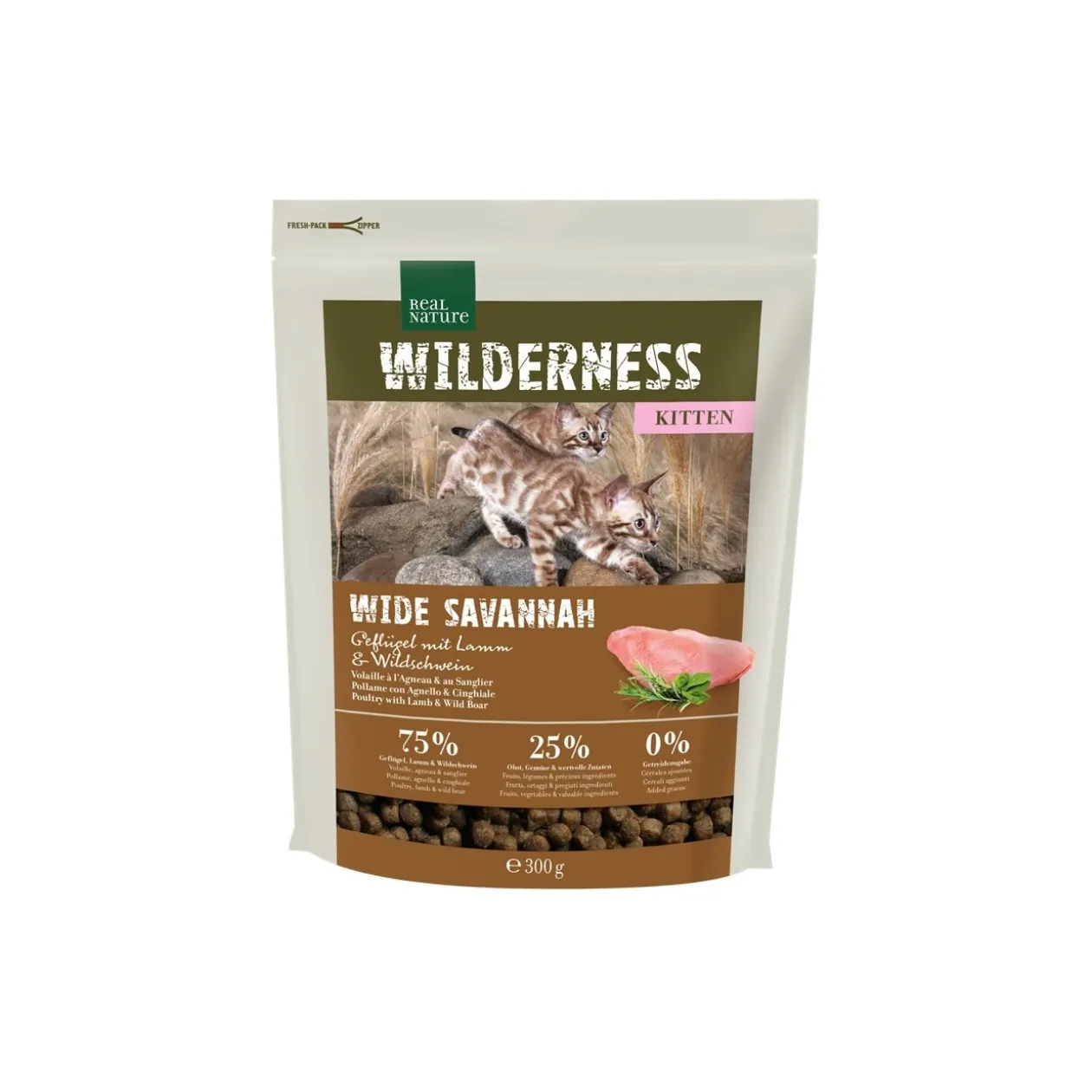 Cette formule REAL NATURE WILDERNESS se compose de 75 % de volaille, de sanglier et d’agneau de qualité supérieure, de 25 % de fruits et de légumes.