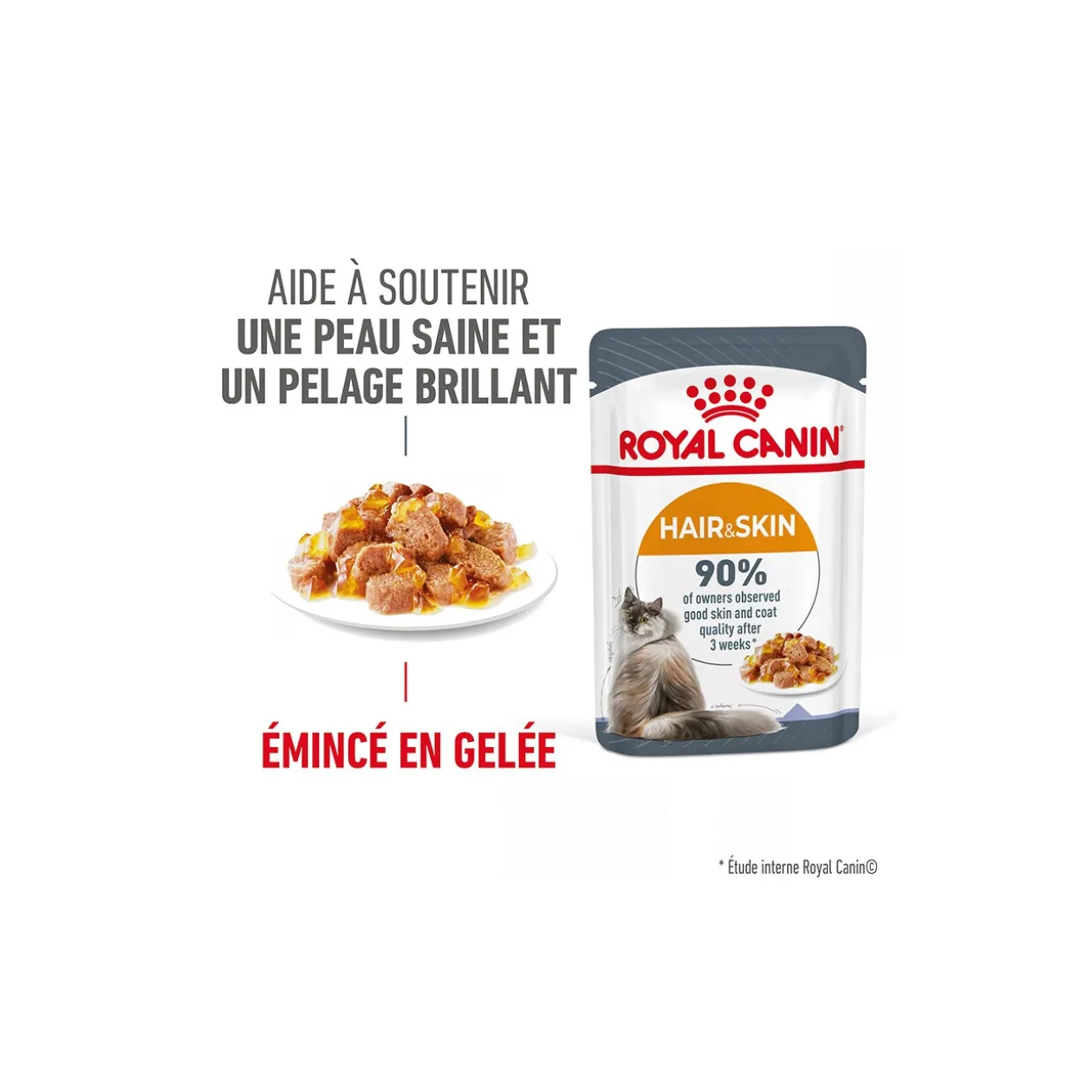 L’alimentation de votre chat joue un rôle important pour sa santé. La gamme ROYAL CANIN ® Feline Care Nutrition comprend des aliments spécialement adaptés aux sensibilités fréquentes de votre chat.L’état de la peau et du poil d’un chat est un bon indicateur de sa santé générale. Un poil sain doit être brillant et lisse. Un comportement de léchage excessif ou des griffures peuvent nuire à la barrière cutanée protectrice et endommager la peau.ROYAL CANIN ® Hair & Skin Care petits morceaux en sauce est une formule complète et équilibrée, spécialement conçue pour soutenir la santé de la peau et du poil de votre chat. Cette formule contient des acides gras Oméga 3, dont l’EPA et le DHA, et Oméga 6, pour renforcer et nourrir la peau et le poil de votre chat.ROYAL CANIN ® Hair & Skin Care a obtenu des résultats tangibles. Notre étude* a montré que plus de 90 % des propriétaires d’animaux ont pu constater une amélioration de la qualité de la peau et du pelage après 3 semaines d’alimentation avec le programme de nutrition Hair & Skin Care (une combinaison d’aliments secs et humides). ROYAL CANIN ® Hair & Skin Care est disponible en morceaux fins en gelée, en mousse ou en nourriture sèche. Un mélange de nourriture humide et sèche permet aux chats de varier les plaisirs. Alors que la nourriture sèche a un effet brossage des dents et est facile à stocker, la teneur en humidité de l’aliment humide favorise l’hydratation et la santé des voies urinaires. Tous les produits ROYAL CANIN ® sont soumis à un processus de contrôle de qualité complet afin de garantir la meilleure qualité possible. Si votre chat mange des morceaux fins en sauce ROYAL CANIN ® Hair & Skin Care, il reçoit une alimentation complète et équilibrée. *Étude interne Royal CaninDesign de produit modifié, formule inchangée : ROYAL CANIN ® Intense Beauty devient ROYAL CANIN ® Hair & Skin Care.