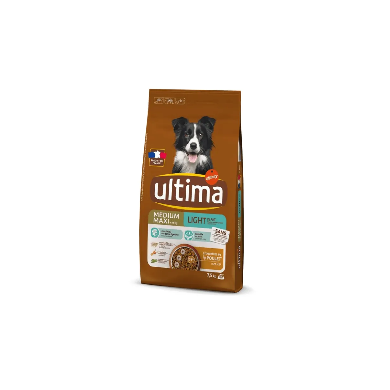 - Contrôle du poids: Grâce à 15 % de matières grasses en moins* et une recette peu calorique, avec des fibres et de la L-carnitine. *Par rapport à Ultima Medium-Maxi Adulte (multi-croquettes)